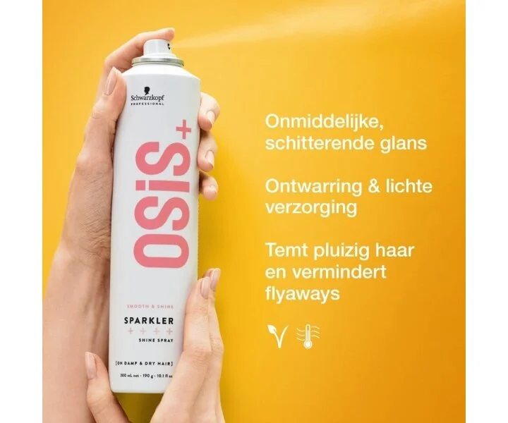 Bring the glamour! De Schwarzkopf OSiS+ Smooth & Shine Sparkler is een glanzende spray vrij van siliconen met een vegan formule. De shine spray laat geen olie of vettigheid achter in het haar of op je handen. De Smooth & Shine Sparkler heeft een siliconenvrije formule en zorgt ervoor dat je haren er glamoureus en glanzend uitziet zonder klitten of pluizigheid. Je haar kamt makkelijker door en geeft een onmiddellijke, schitterende glans. De verzorgende spray temt pluizig haar en vermindert flyaways in een notendop.
